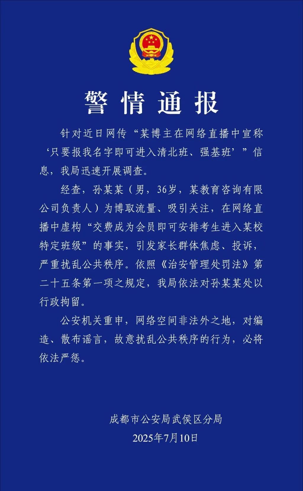 针对近日网传“某博主在网络直播中宣称‘只要报我名字即可进入清北班、强基班’”信息,我局迅速开展调查。
