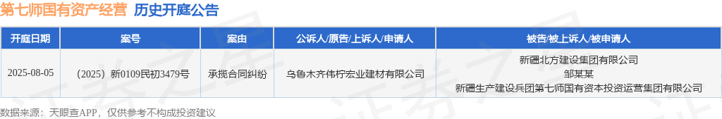 本站消息金策宝,根据天眼查APP显示,近日公布了一则新疆生产建设兵团第七师国有资本投资运营集团有限公司作为被告/被上诉人的开庭公告,详细内容如下: