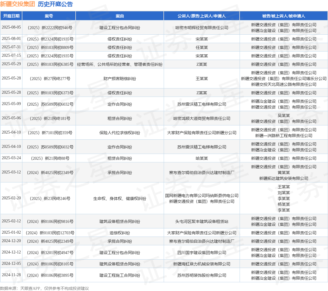 案号:(2025)新2222民初946号审理法院:巴里坤哈萨克自治县人民法院案由:建设工程分包合同纠纷当事人信息: 原告/上诉人:哈密市明辉经贸有限责任公司 被告/被上诉人:新疆交通投资(集团)有限责任公司、新疆冶金建设(集团)有限责任公司开庭日期:2025年8月5日根据统计,近一年内以新疆交通投资(集团)有限责任公司为当事人的历史开庭公告有25则,其中案由为“侵权责任纠纷”的公告以4则居首,其次为“建筑设备租赁合同纠纷”有3则,“承揽合同纠纷”有3则。历史开庭公告(前20条)如下: