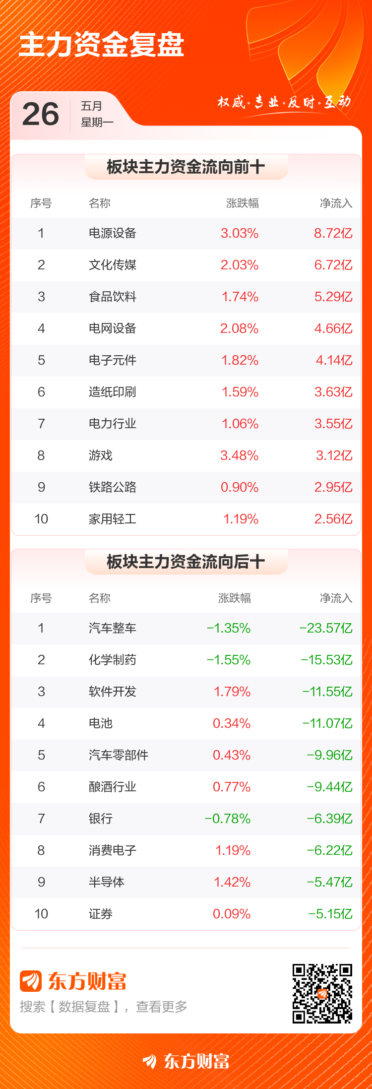 5月26日,沪指跌0.05%,深成指跌0.41%,创业板指跌0.8%。两市成交额1.01万亿,较上个交易日缩量1456亿。数据显示,今日大盘主力资金净流出120.26亿。电源设备、文化传媒、食品饮料等板块主力资金流入排名居前,其中电源设备净流入8.72亿元。