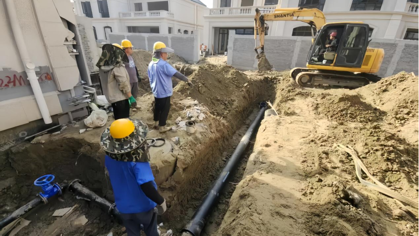 (海安市惠泽净水有限公司施工人员正在进行管网铺设)