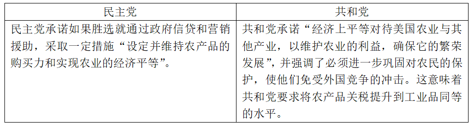 表1、1928年大选期间民主党和共和党应对农业萧条的政策主张